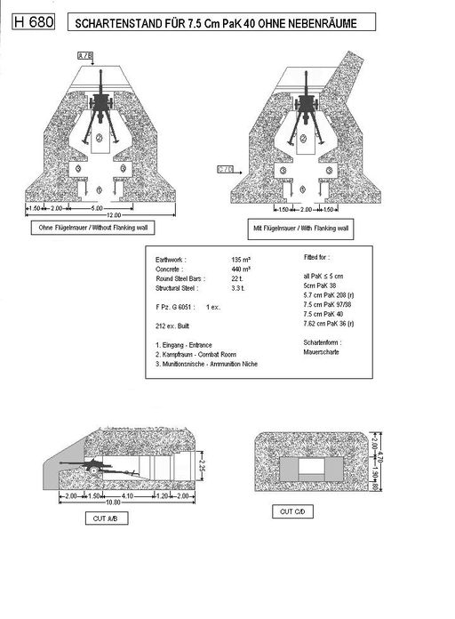 Typologie : casemate de type 680 pour canon de 75 mm antichars avec soutes à munitions (440 m3 de béton / plan apparu en mars 1943). Dessin Patrick Fleuridas, Belgian Bunkersite (http://www.bunkers.be)Immatriculation