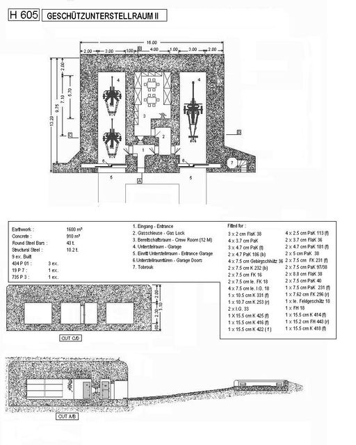 Typologie : abri de type 605 pour deux canons avec chambre de troupe. Dessin Patrick Fleuridas, Belgian Bunkersite (http://www.bunkers.be)Immatriculation