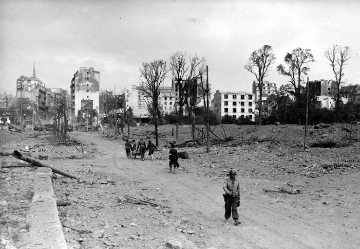 Vue de la Place de la Liberté, fin 1944. Un soldat américain descend la rue tandis que des civils la remontent. A l'arrière-plan : on voit le début de la rue Jean-Jaures et des véhicules. Visible aussi : le clocher de l'église Saint-MartinImmatriculation