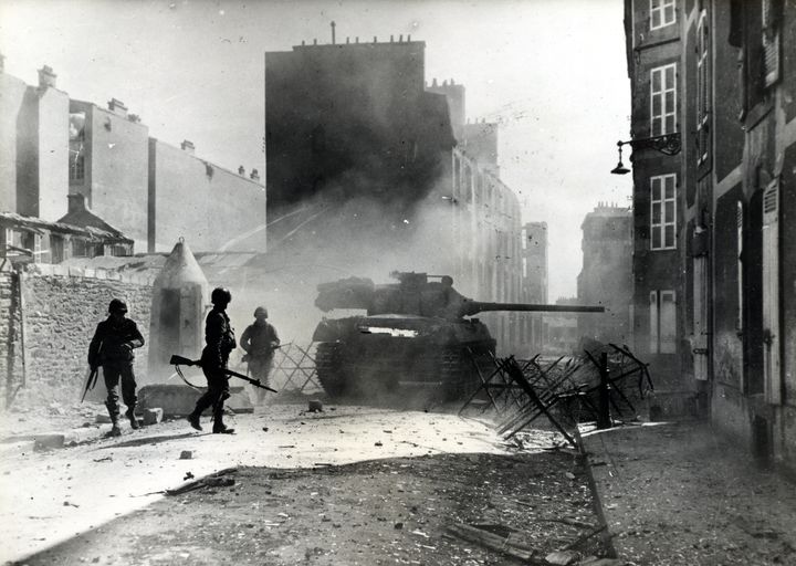 Vue de la bataille de Brest, septembre 1944. Char américain M18 Hellcat dit chasseur de char tirant rue Kerfautras. On distingue trois soldats américains armés de leur fusil à baionnette à côté d'une guérite allemande en béton armé et d'un barrage allemandImmatriculation
