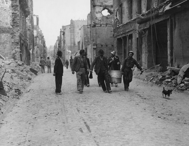 Vue d'un convoi de distribution de soupe par des hommes de la défense passive portant brassards et casques rue de Siam, septembre 1944Immatriculation