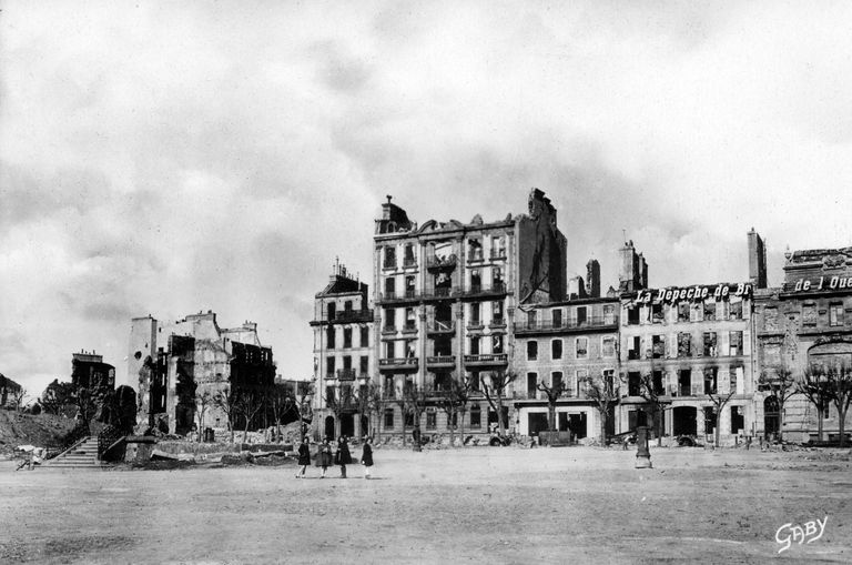 Vue de la Place Wilson, fin 1944-1945, carte postale (Gaby). On distingue les vestiges du Kiosque à musiqueImmatriculation