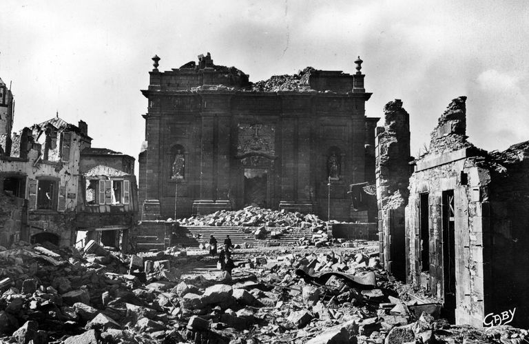 Vue de l'église Saint-Louis : élévation orientale, fin 1944-1945, carte postale (Gaby)Immatriculation