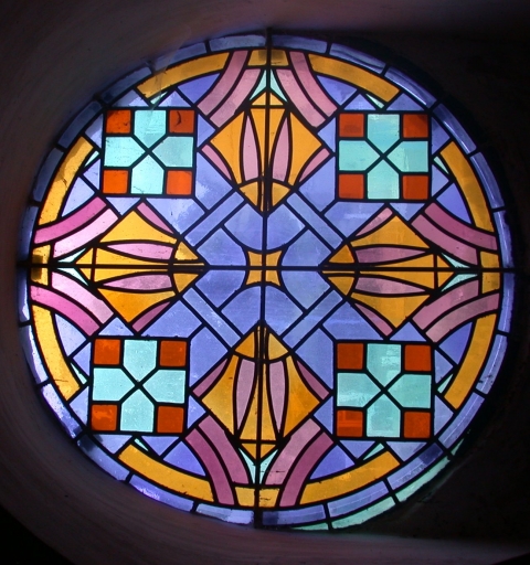 Verrières à personnages des baies 1, 2, 4, 6 : Bienheureuse Jeanne d'Arc, Saint Michel, Notre-Dame de Lourdes, Sainte Philomène et verrières décoratives des baies 3, 8, 00,