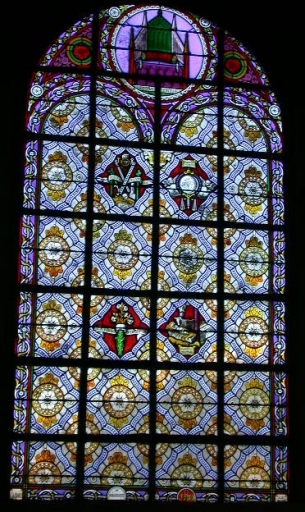 Ensemble de 6 verrières géométriques figurées du choeur et du transept : Litanies de la Vierge et Symboles de l'Eglise, et des verrières à personnages de la nef : Saint Pierre, Saint Joseph et l'Enfant, Notre-Dame de Lourdes et de Pontmain, Sacré Cœur,