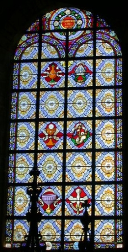 Ensemble de 6 verrières géométriques figurées du choeur et du transept : Litanies de la Vierge et Symboles de l'Eglise, et des verrières à personnages de la nef : Saint Pierre, Saint Joseph et l'Enfant, Notre-Dame de Lourdes et de Pontmain, Sacré Cœur,