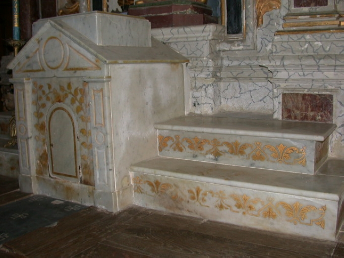 Ensemble de l'autel de la Vierge : autel, tabernacle, 2 gradins d'autel, retable,