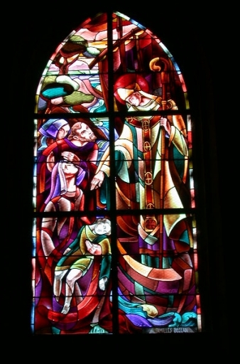 8 verrières, baies 5 à 14 : Saint Yves, Présentation de l'Enfant au temple, saint Roch, saint Esprit, Christ, Jeanne d'Arc, saint Evêque, Dieu le Père,