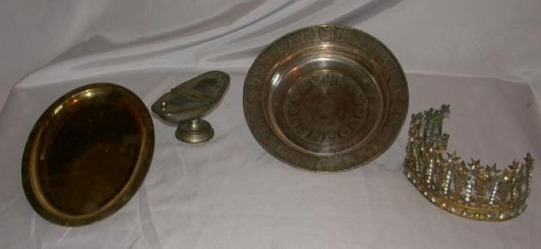 Plateau de communion, navette à encens, plat de quête et couronne de statueImmatriculation