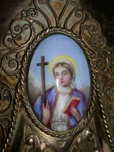 Chapelle d'orfèvrerie dans sa boîte : calice, patène, 2 burettes et leur plateau, clochette,