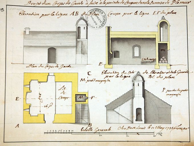 Coupe, élévation et plan d'un corps de garde (projet) à faire pointe de Bregan dans la paroisse de Plemur (Ploemeur : ?, Morbihan), fait à Port Louis le 11 mai 1744 par FrézierImmatriculation