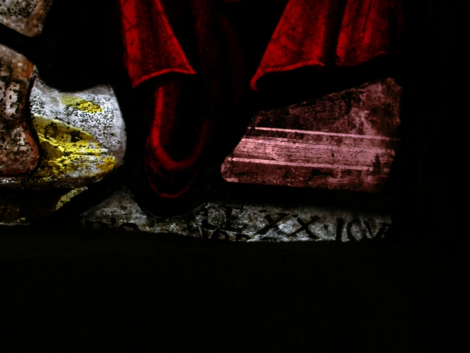 Verrière nord, premier registre, panneau droit, détail de l'inscription.Immatriculation
