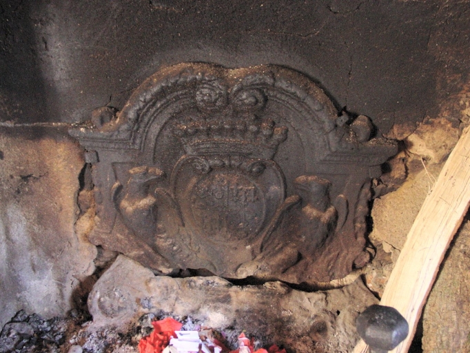 Logis, cheminée salle ouest. Détail taque de cheminée, aux armes de Keravéon (?)Immatriculation