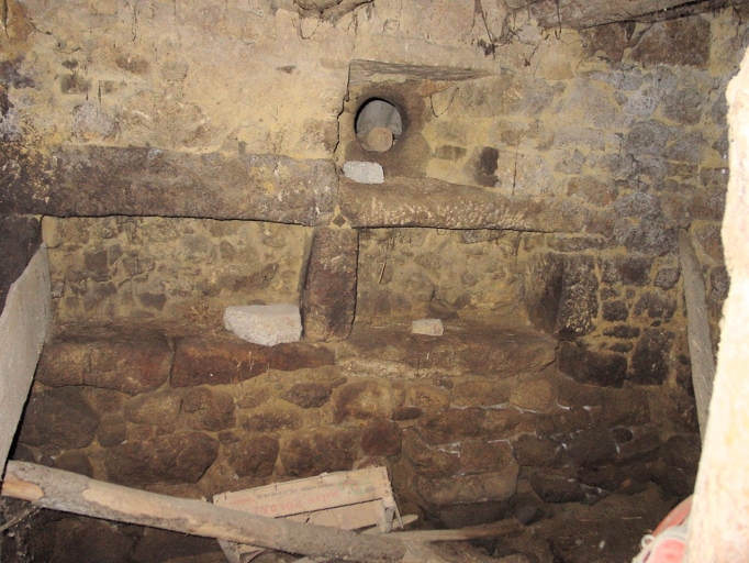 Grange-fournil, vue intérieure, étagères et occulus intégrés au mur nord.Immatriculation