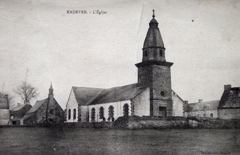 Vue sud-ouest de l'église dans son enclos, vers 1920.Immatriculation