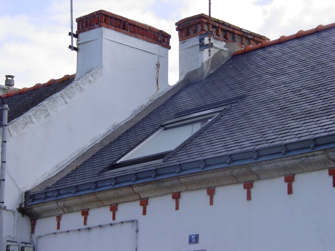 3 et 5 rue P. Loti : détail du décor de briques sur souches de cheminées et corniche.Immatriculation