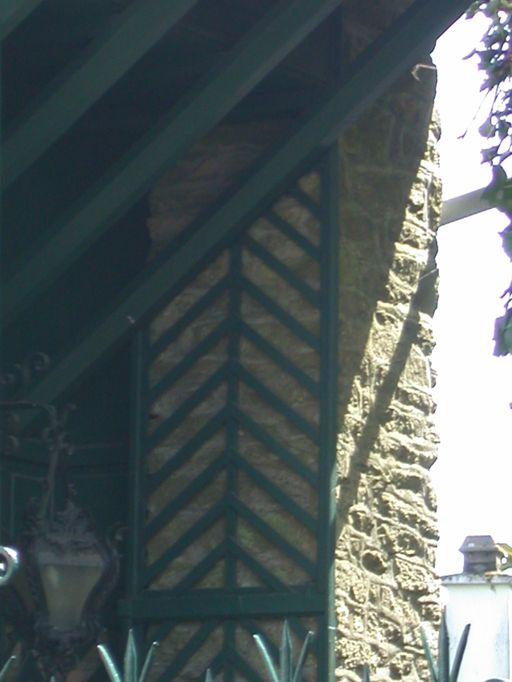 Détail de l'entrée de la maison sous appentis.Immatriculation