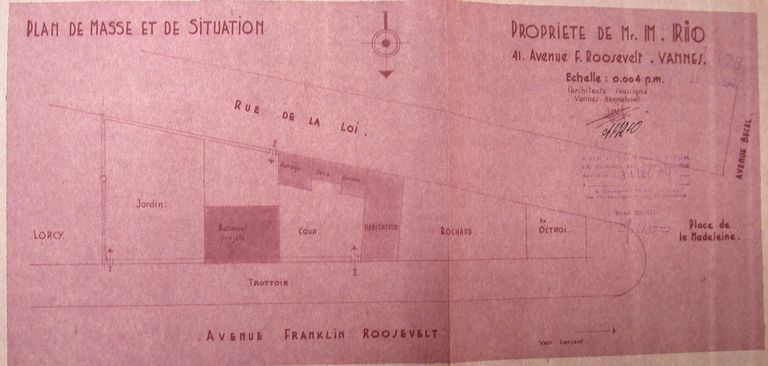 Plan de masse et de situation de la propriété de monsieur Rio par Perrin, 1947 : situation de l'octroi indiquée. AM Vannes 1G59.Immatriculation
