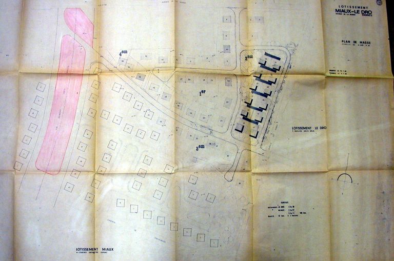 Plan de masse du lotissement Miaux-Le Dro (arch. Y. Guillou, Géom. Couédel) en périphérie sud de l'avenue de la Marne (lieu-dit de Kernoguet) dressé en 1969. AM, Vannes 1O216.Immatriculation