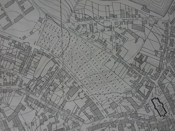 Plan de la ville par Guillerminet, Ministère de la Reconstruction, 1947 : détail cimetière de Boismorault. AM Vannes 9Fi.Immatriculation