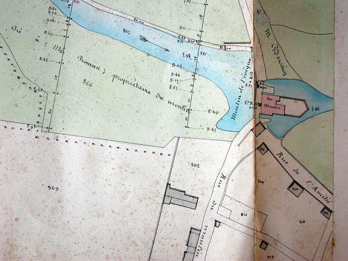Projet de règlement d'eau du moulin de l'Evêque. Partie est, détail du moulin. Plan, par Fréminville, 1857. AD Morbihan, S 1152.Immatriculation