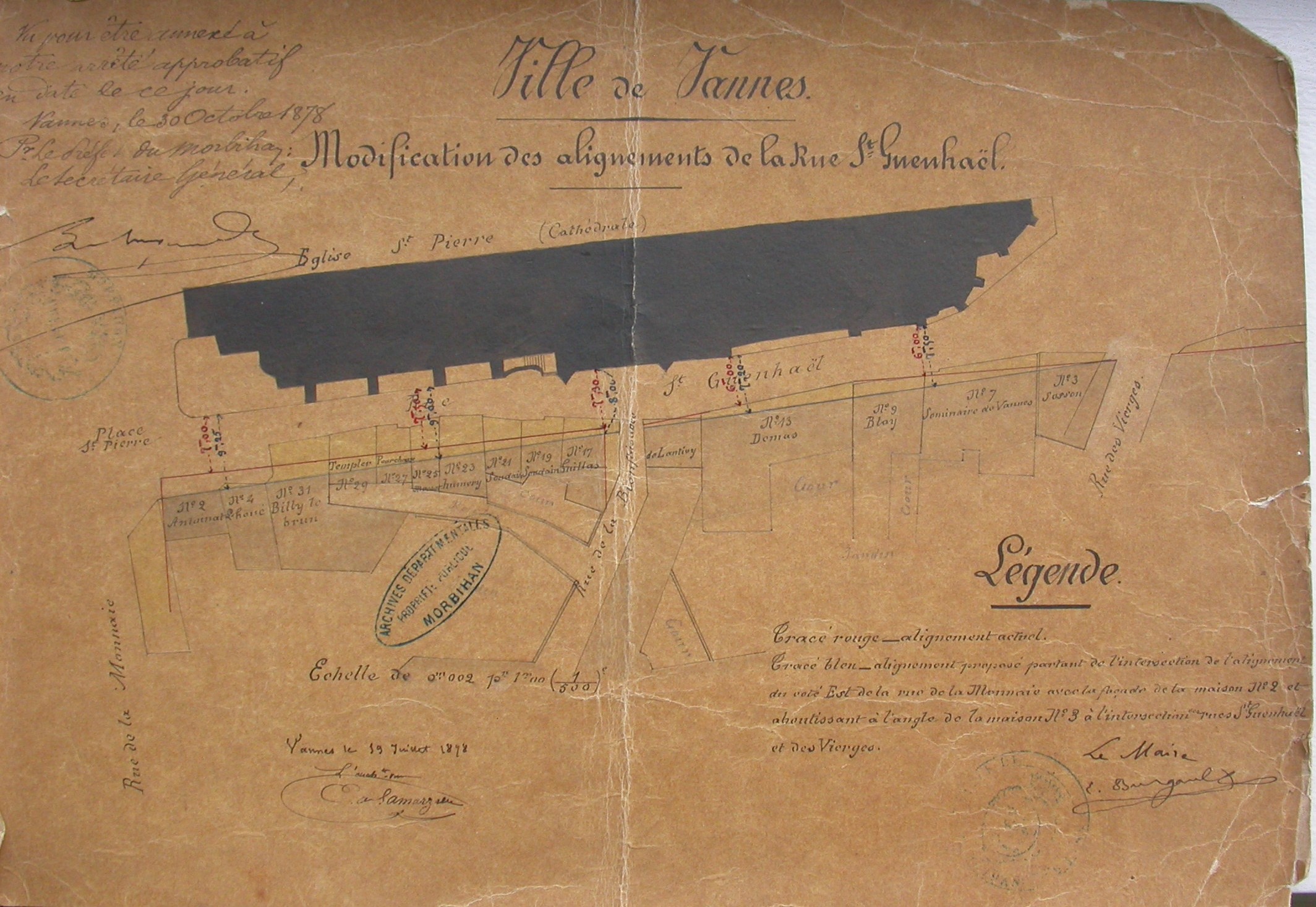 Modification des alignements de la rue Saint-Guénael. Plan par E. de Lamarzelle, 1878. AD Morbihan.Immatriculation