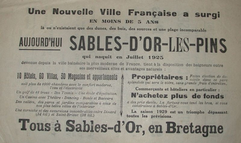 Sables-d'Or-les-Pins. Dépliant publicitaire daté de 1929, pour la vente de lots par la SCI de Brouard (BM Dinan)Immatriculation