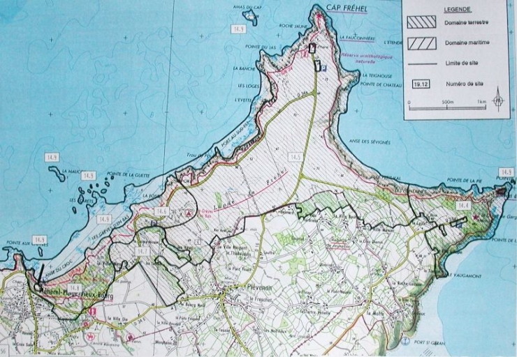 Cartographie des espaces littoraux remarquables : falaises et landes du cap Fréhel, dune de la Fosse et abords, dunes du Vieux-Bourg, côte de la Ville-Men, le Bourg Neuf, les Vaux, estran nord-ouest (DIREN Bretagne)Immatriculation