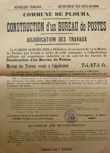 Annonce de l'adjudication publique des travaux de construction du bureau de postes de Plouha (AD 22)Immatriculation
