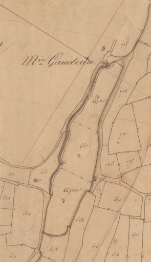 Extrait du cadastre 1833 : le moulin Godeau et son bief (AD 22)Immatriculation