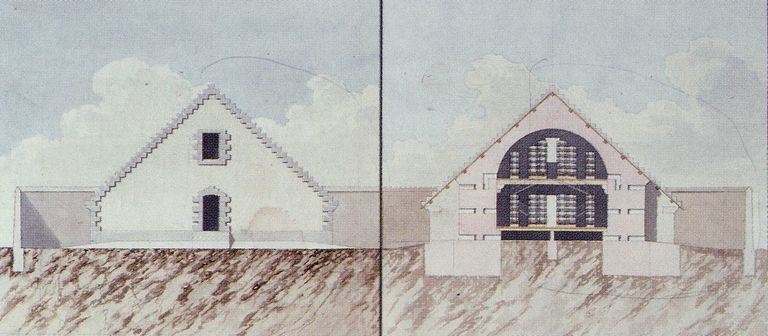 Coupe et élévation de l'un des trois magasins à poudre dits "poudrières maritimes" de l'île des Morts, Travaux Maritimes, 1813Immatriculation