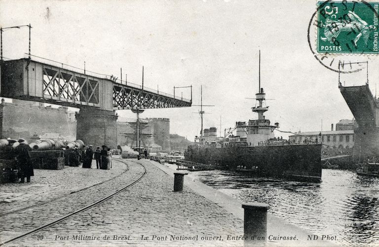 Vue de l'arsenal de Brest et du pont tournant (ouvert) : entrée d'un cuirassé dans la Penfeld et l'arsenal. En arrière-plan : le château. Carte postale (N.D. Phot.)Immatriculation