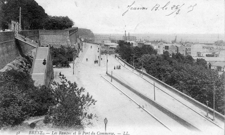 Vue de Brest : rampes reliant la ville au nouveau port de commerce de Porstrein construit sous le Second Empire. L'escalier est doté d'une passerelle amovible et d'une porte fortifiéeImmatriculation