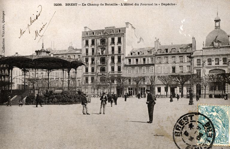 Vue de Brest : le Champ de Bataille et l'hôtel du journal la Dépêche. Carte postale (Collection Villard, Quimper)Immatriculation