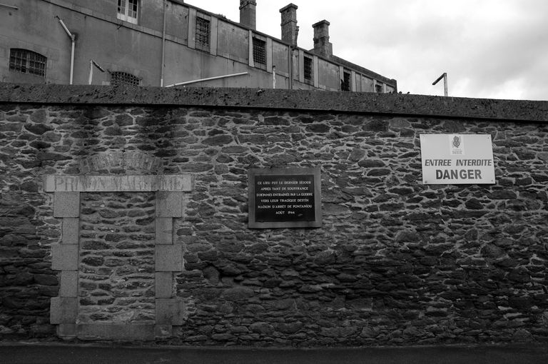 Vue du mur de clôture depuis la rue de Pontaniou : porte piétonne murée et plaque commémorative. Sur le linteau de la porte, on peut lire PRISON MARITIME (inscription antérieure à 1952)Immatriculation