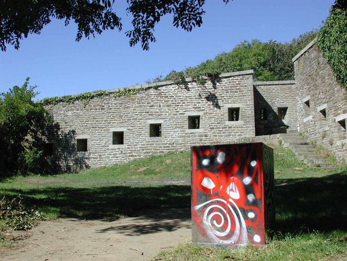 Vue du fort du Dellec : mur d'enceinte ouest percé de créneaux de fusillade. Bastionnet à mâchicoulis ou créneaux de piedImmatriculation