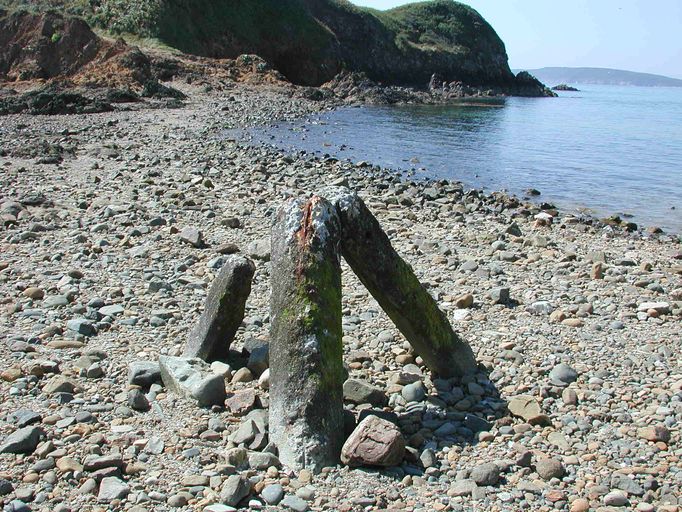 Crozon : vue de l'île de l'Aber, marée basse, défense de plage de type tétraèdre en béton arrmé (vestiges de la Seconde Guerre Mondiale)Immatriculation