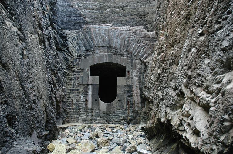 Vue de l'une des deux embrasures : couloir aménagé dans le terre-plein / falaise de la batterie de Vauban pour permettre le passage des obus (état en 2005)Immatriculation