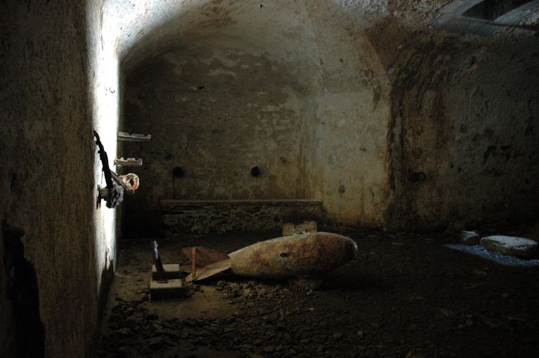 Vue intérieure (état en 2005). Au sol, un flotteur / réservoir ayant servi à un exercice militaireImmatriculation