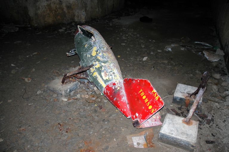 Vue intérieure (état en 2005). Au sol, un flotteur / réservoir ayant servi à un exercice militaire. Il est marqué ThomsonImmatriculation