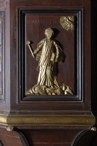 Cuve : panneau montrant saint Armel, l'inscription et la dateImmatriculation