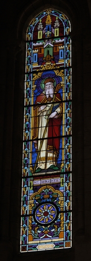 Verrières à personnages des baies 3 à 6, 8, 17 à 24, 100 à 104, 00 : Sacré Coeur, Saints Aubin, Louis, Pierre, Augustin, Jean, François d'Assise, Joachim, Michel, Immaculée Conception, Sainte Anne et verrières décoratives des baies 1, 2, 105 à 108,