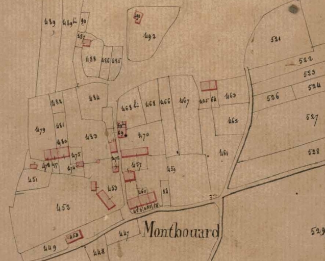 Vue de la ferme sur le cadastre napoléonien de 1827 : parcelles 478, 477 et 474Immatriculation