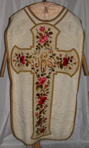 Ornement blanc 1 : chasuble, bourse de corporal, étole, manipule, voile de calice,
