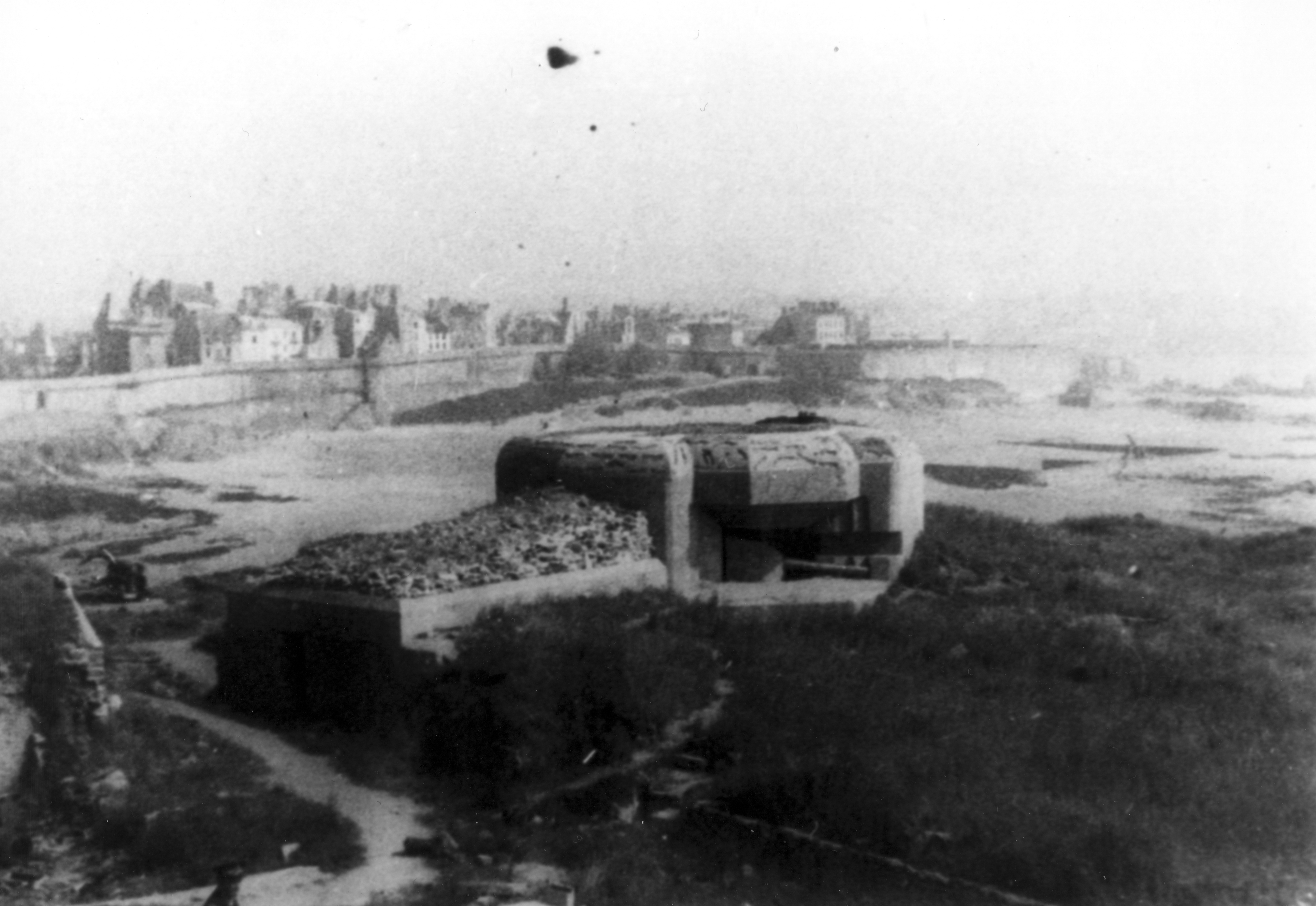 Vue générale de l'une des casemates de l´ensemble fortifié du Grand Bé, vers 1946-1947. En arrière plan, la ville de Saint-Malo (Service Historique de la Marine, Vincennes. Rapport Pinczon du Sel. Livre 2, Doc n° 3, cliché n° 16)Immatriculation