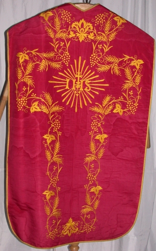 Ornement rouge 1 : chasuble, bourse de corporal, étole, manipule, voile de calice,