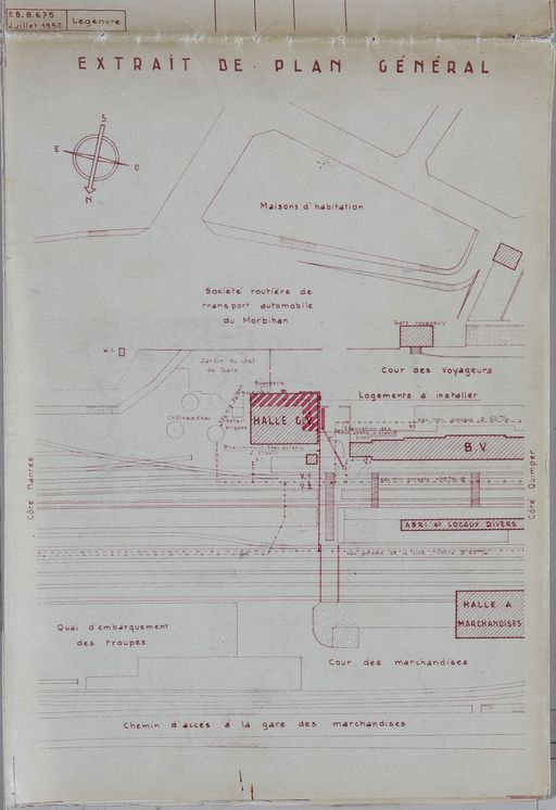 Halle grande vitesse (détruit). Réalisation de deux logements, plan de masse, juillet 1950. Archives de la SNCF, groupe études et bâtiments, Rennes.Immatriculation