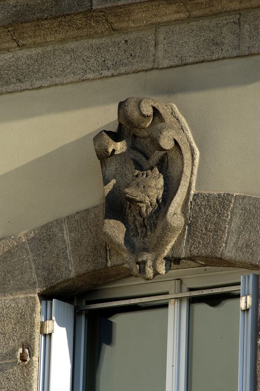 Détail d'une clef d'arc sculptée d'une tête (de chevreuil ou de renard ?)Immatriculation