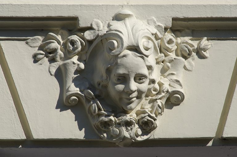Clef passante sculptée d'une tête de femme au-dessus de la porte d'entrée.Immatriculation