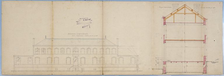 Elévation et coupe de l'école Germaine de Staël par Muiron,1906. AM Vannes 4 M 203.Immatriculation